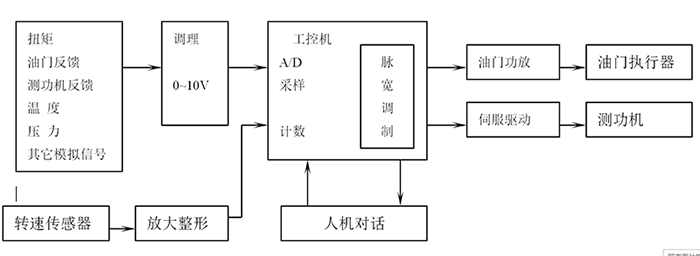 4、測試控制系統 根據技術發展趨勢,選用了高檔工業控制計算機,使用戶升級十分方便,并使各項功能得能進一步加強。 扭矩,溫度,壓力等模擬信號經過調理后,變成0—10V標準模擬信號,經A/D轉換,變成計算機所需的數字量。 轉速信號經整形放大后,直送JS計數卡,經計算機計數后變成相應數字量。 計算機根據采集的數據,綜合用戶面板的給定狀態,經過一系列控制算法的運算,變成直接推動測功機的脈沖信號,實現了計算機直接數字控制(DDC)。